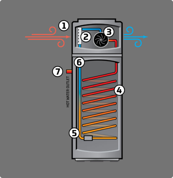 4. The hot gas inside the condenser coil heats the water inside the coil- wrapped tank